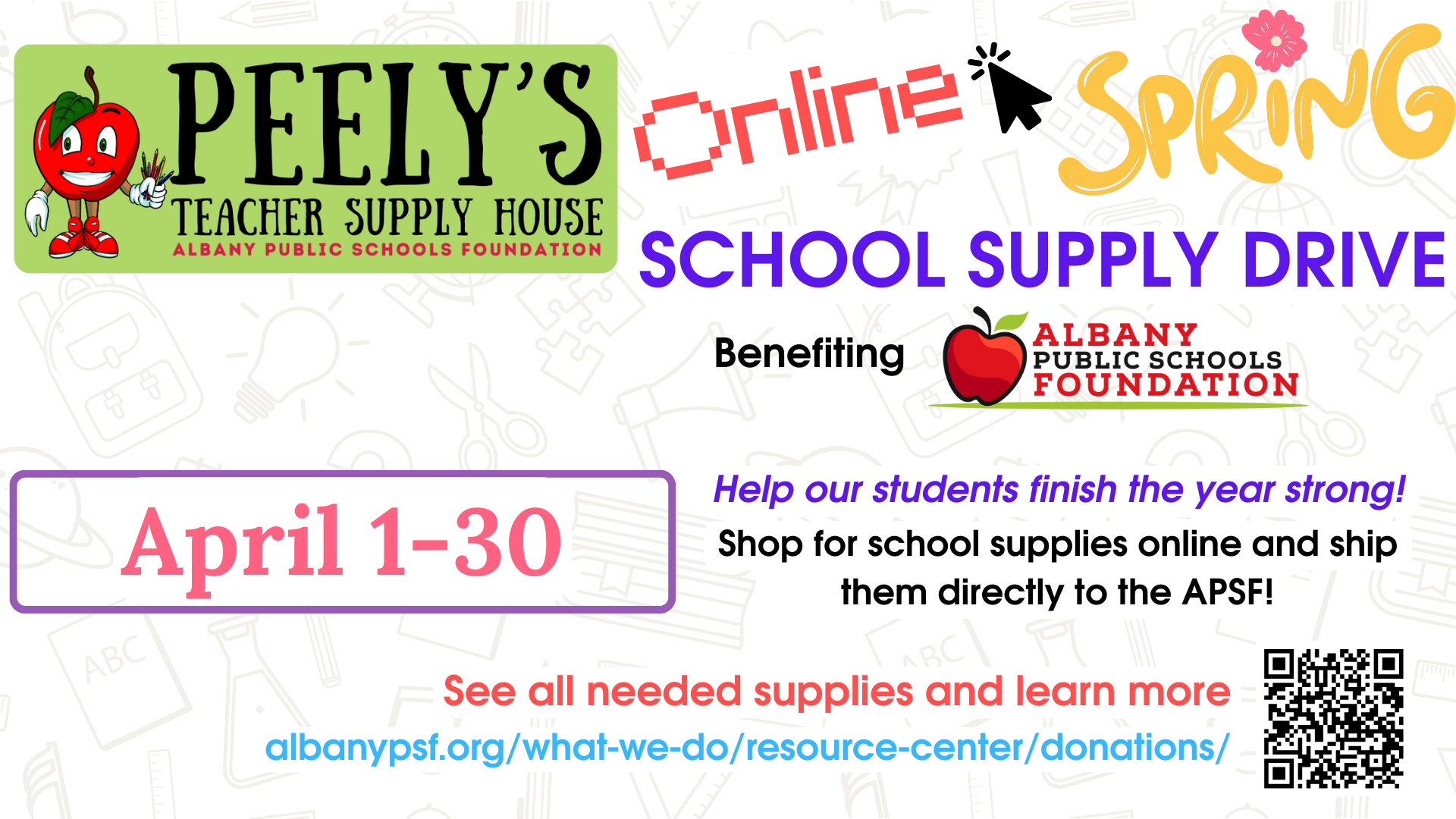 Online School Supply Drive for Peely's Teacher Supply House! April 1-30 Help Our Students Finish the School Year Strong! Purchase school supplies online and ship them to the APSF Shop our Wishlists:  Amazon Walmart MOST NEEDED SUPPLIES Disinfecting Wipes Hand sanitizer (8oz+) Tissues Dry Erase Markers/Erasers Black & Colored Sharpies Post-It Notes Highlighters Glue sticks... Read more »